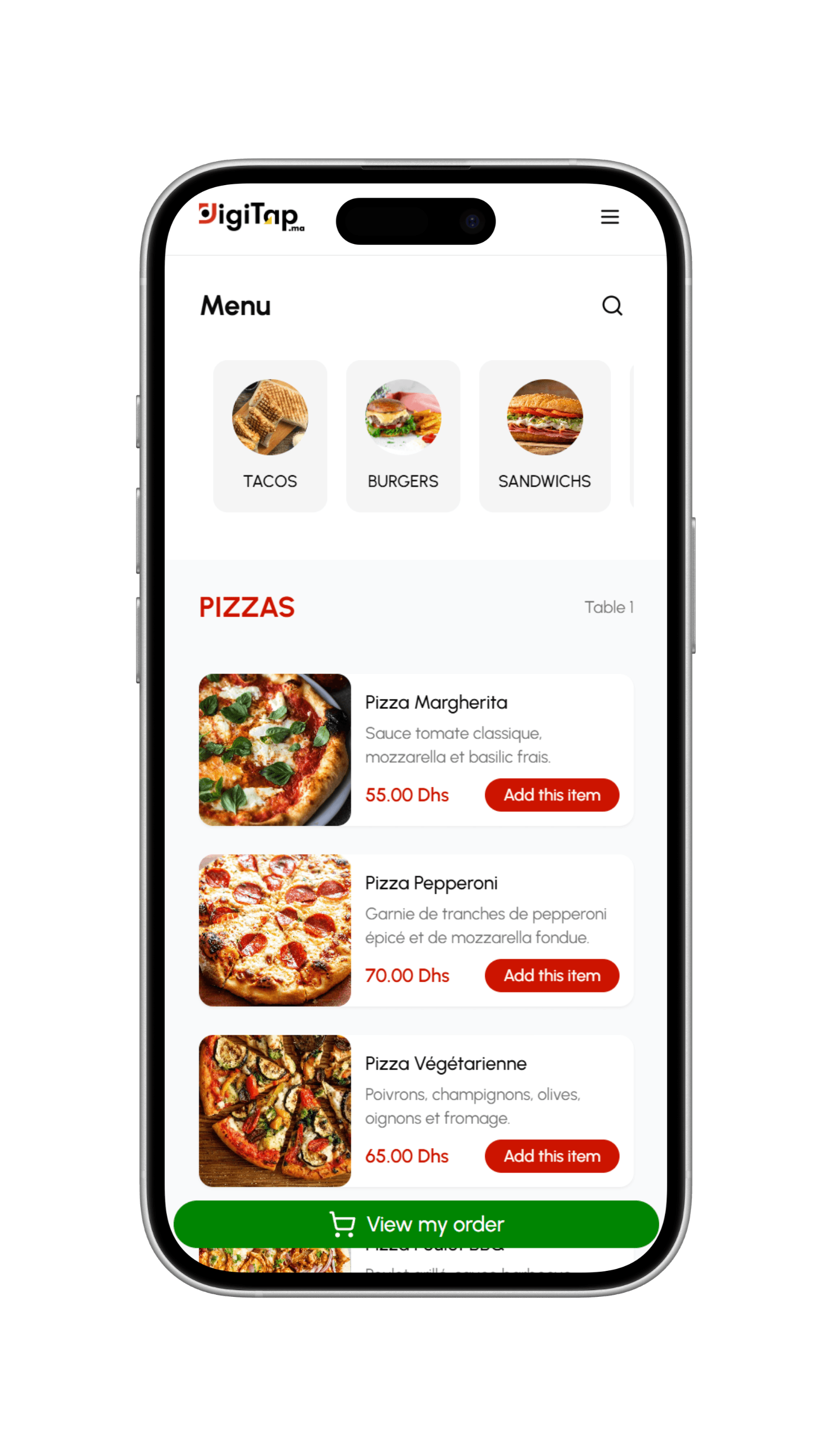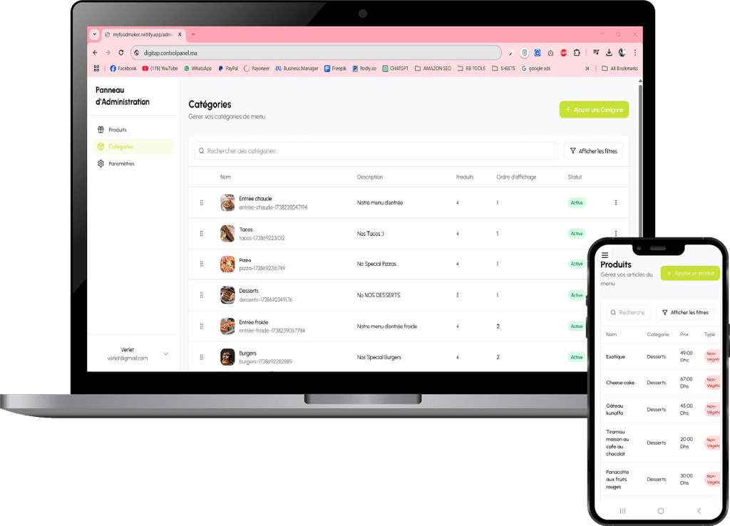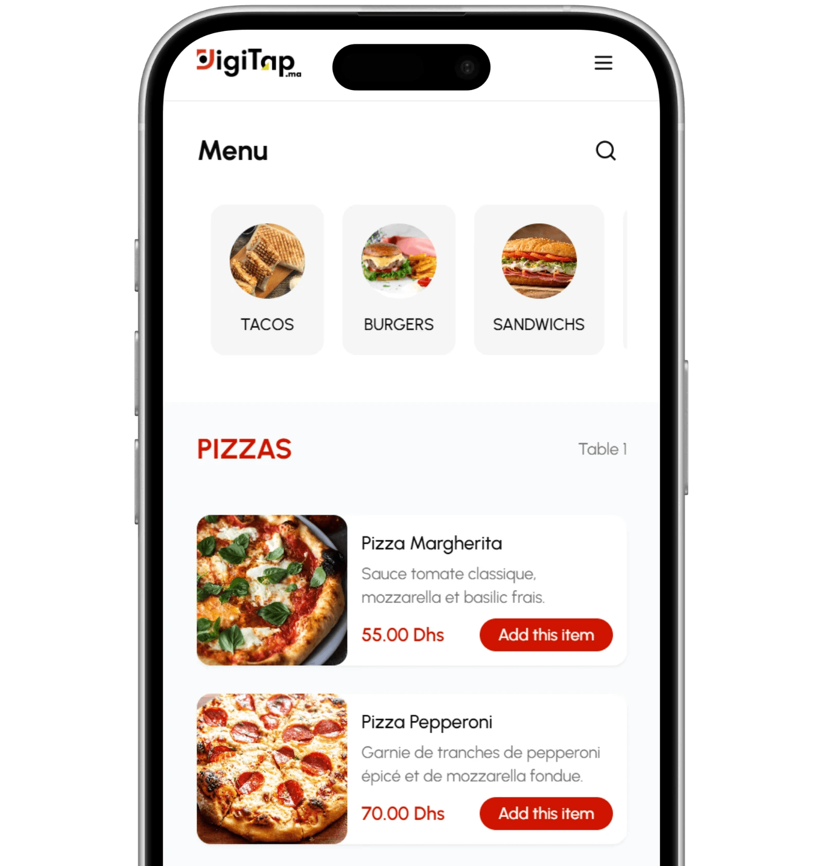 Un menu digital élégant et interactif, accessible instantanément via QR code , permettant à vos clients de commander en quelques clics — tout en vous offrant un contrôle total sur son contenu.