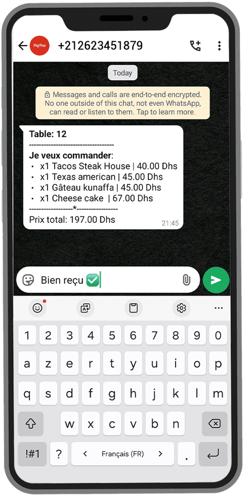 Vos clients passeront leur commande via WhatsApp, un message automatique vous sera envoyé incluant leurs articles choisis ainsi que le numéro de table.